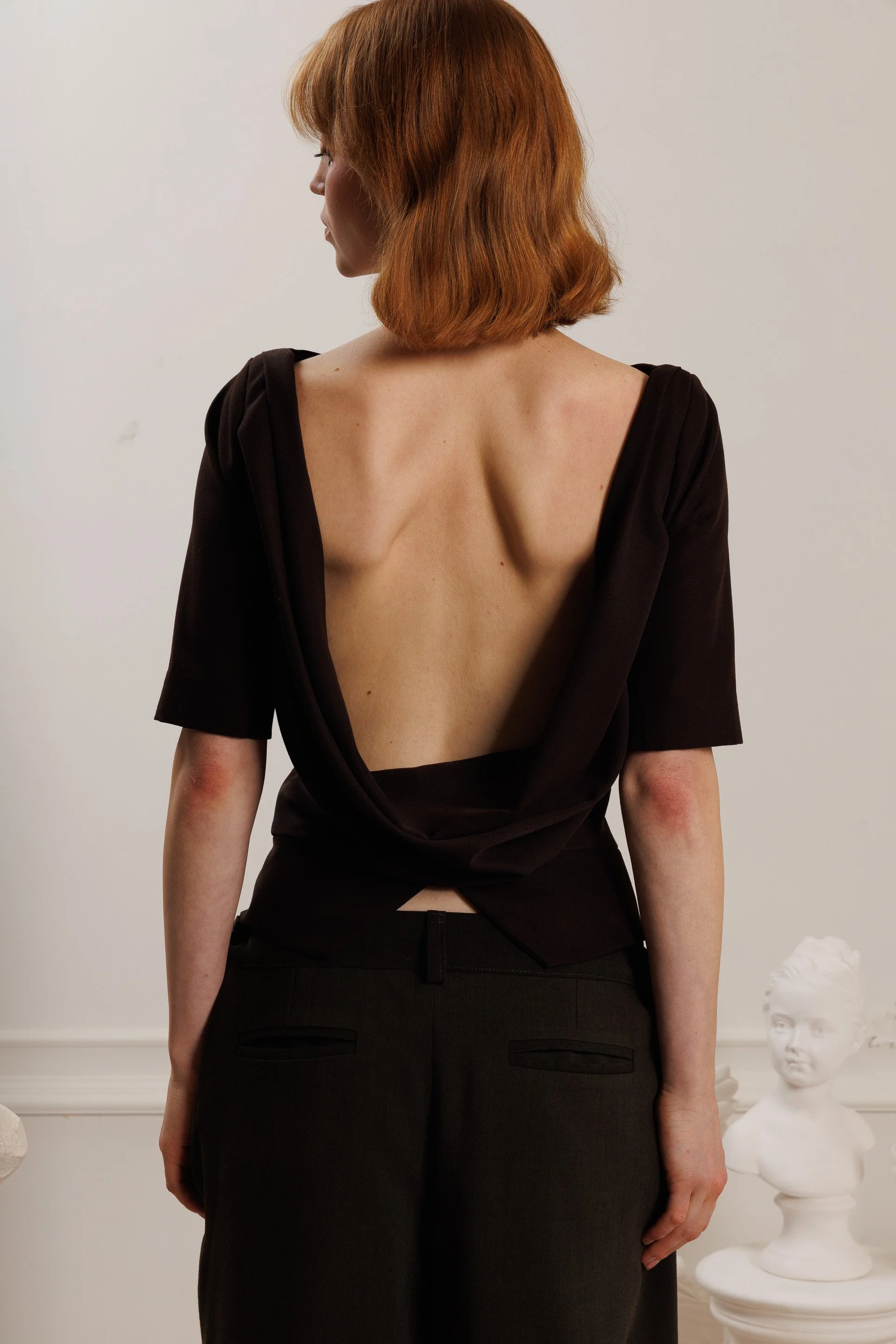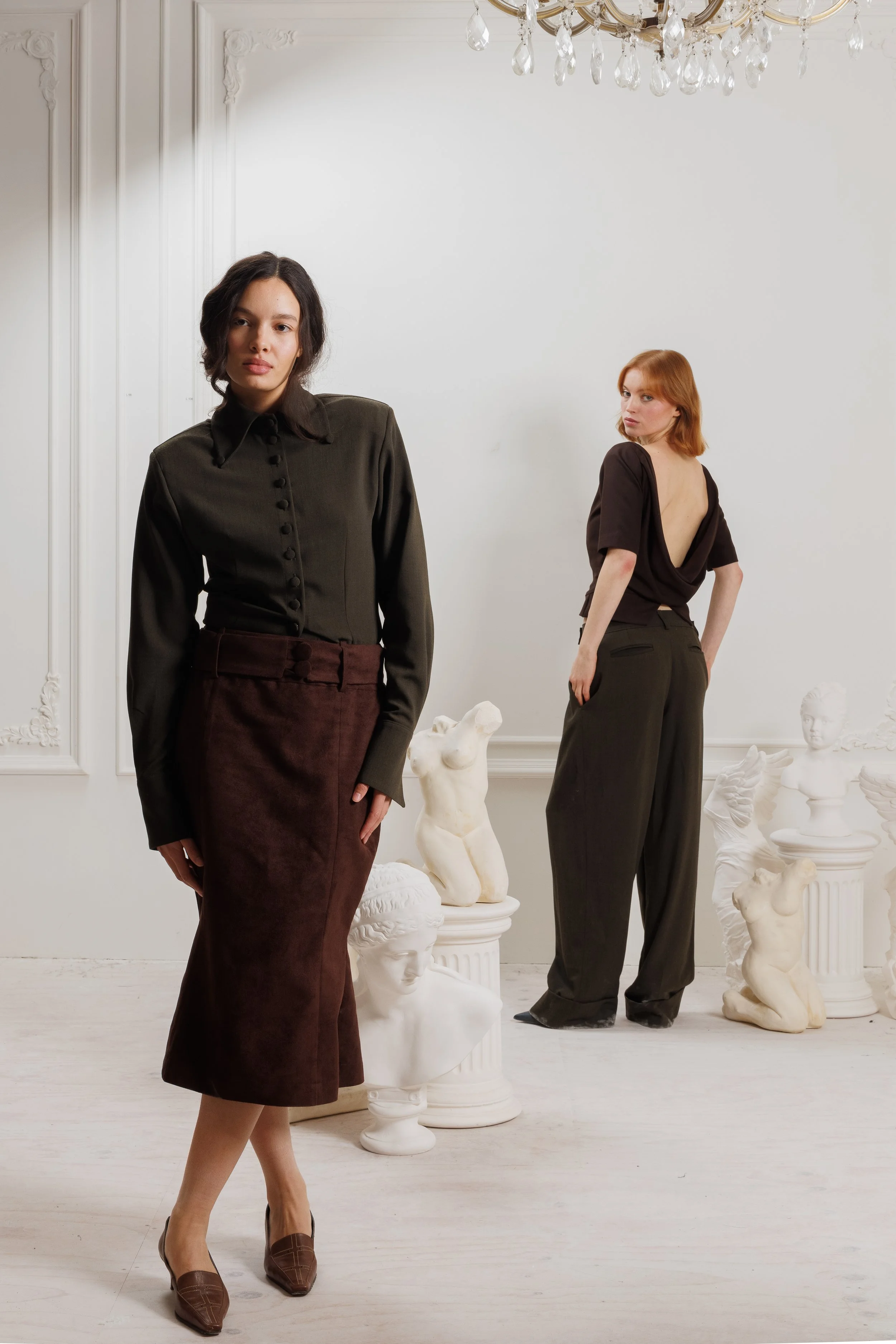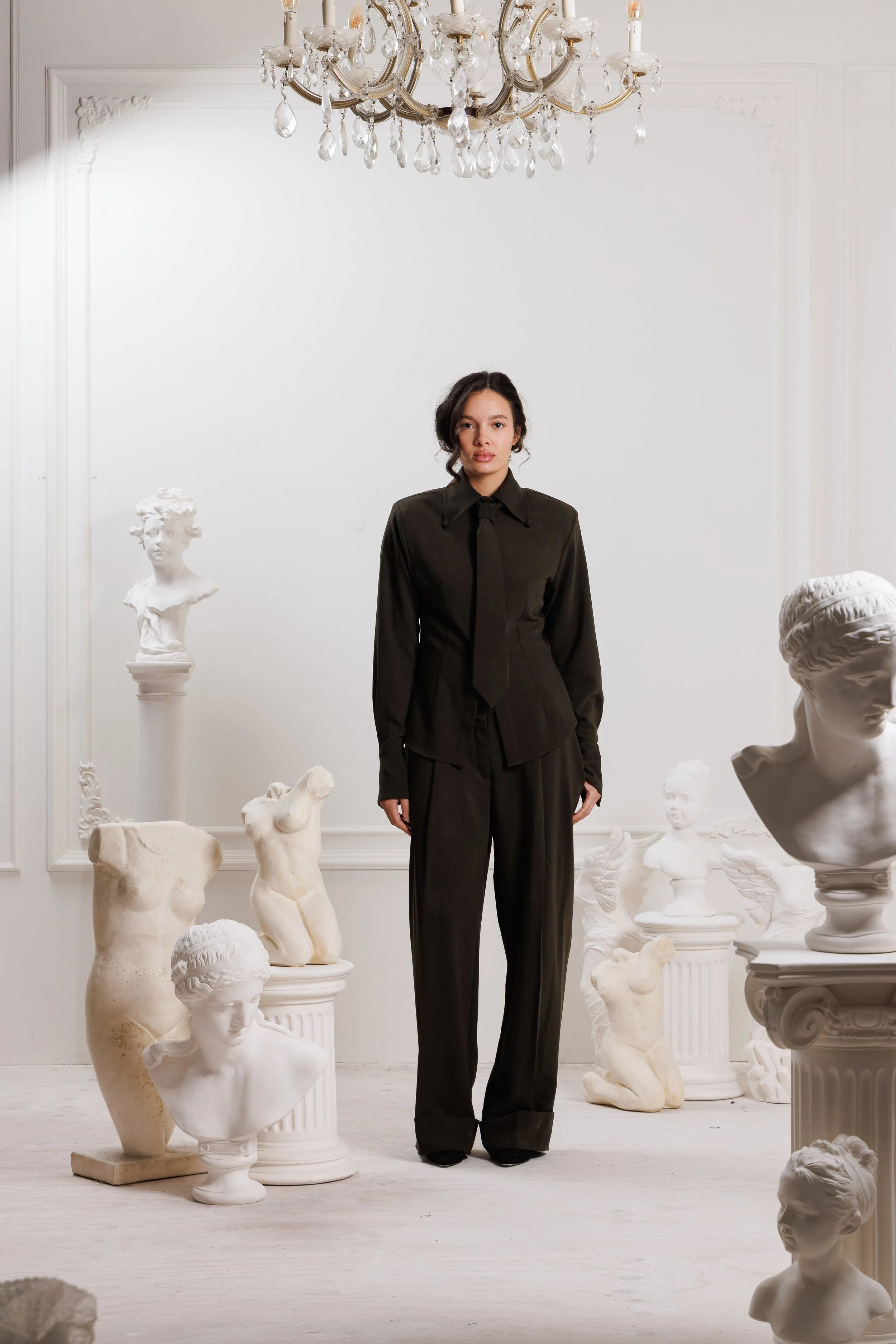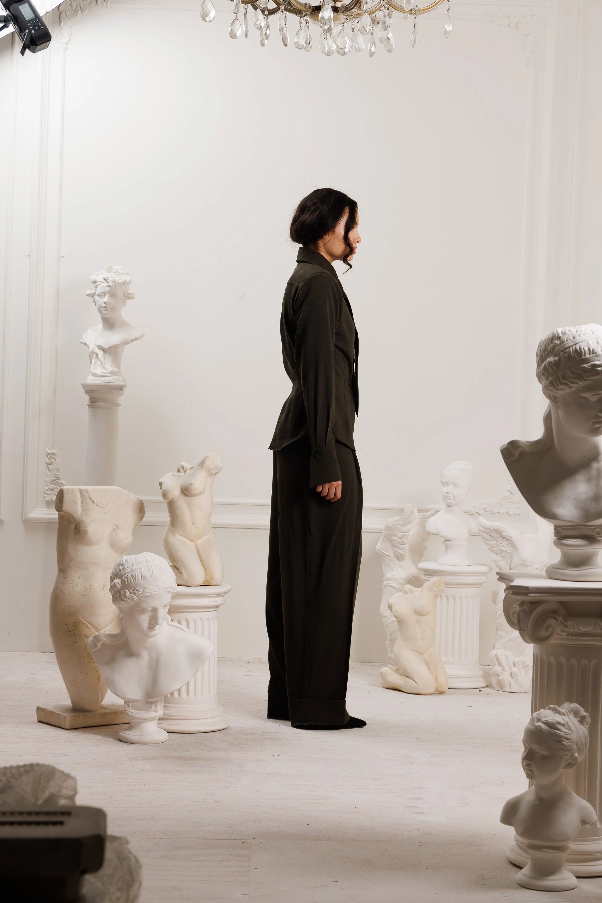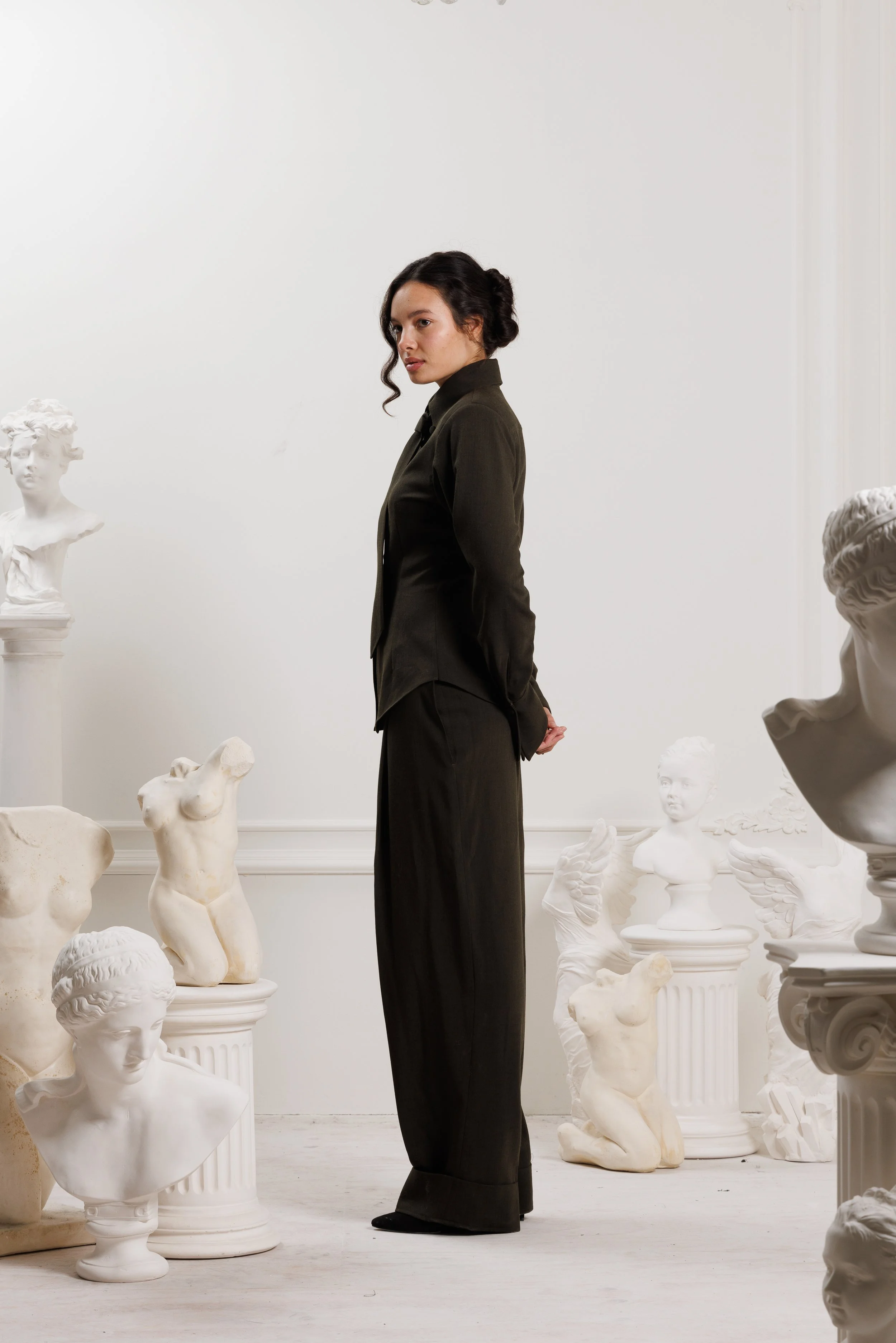 Dark green wool set. Featuring 60s inspired big shoulders button down, with button details at the front. Combined with wide leg pleated trousers. Featuring side and back pockets, front pleats and button details at the waistband. Styled with a wool tie.