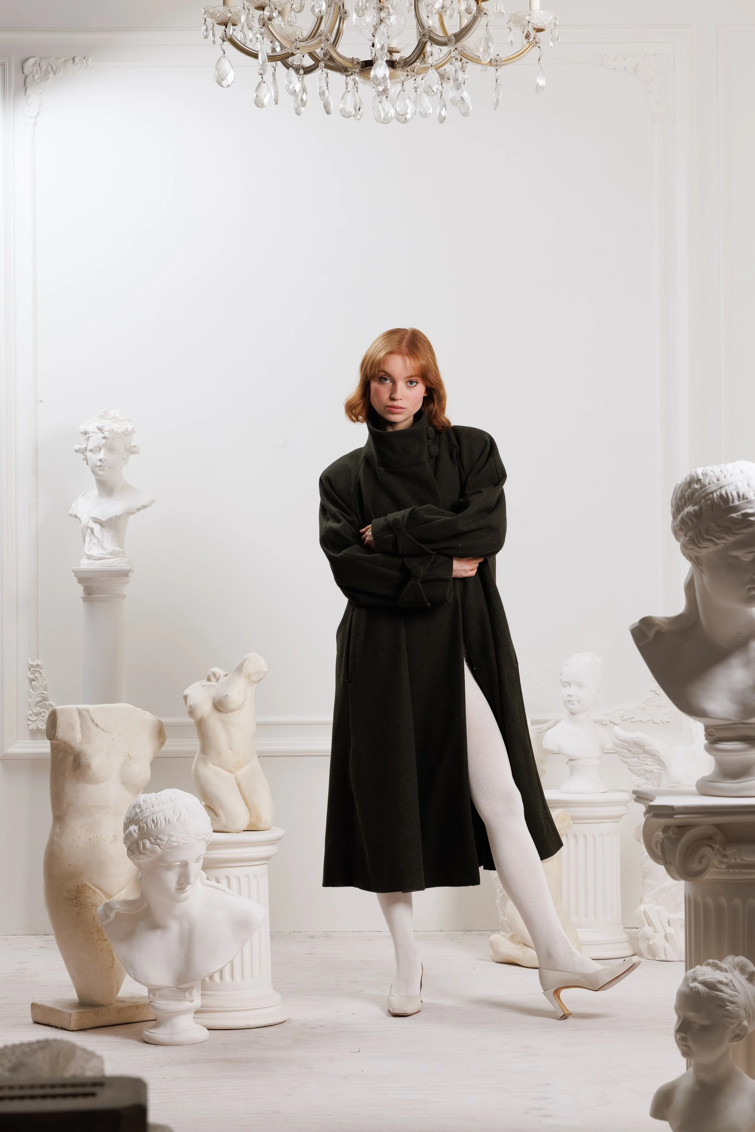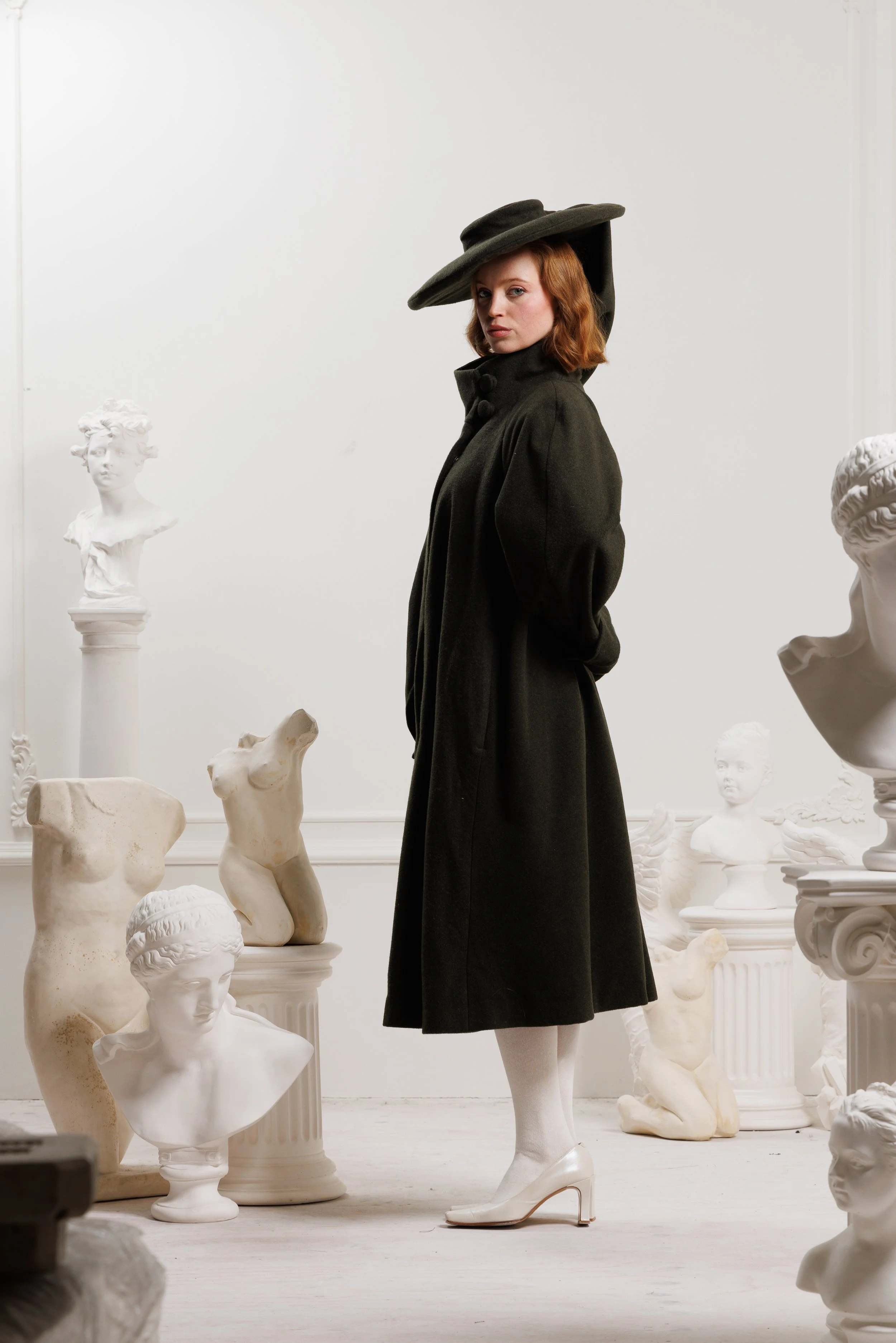Dark green wool coat. Featuring 60s inspired big shoulders, with raglan sleeve. High neck with fabric buttons as a closure. Fully lined and styled with a wool hat.
