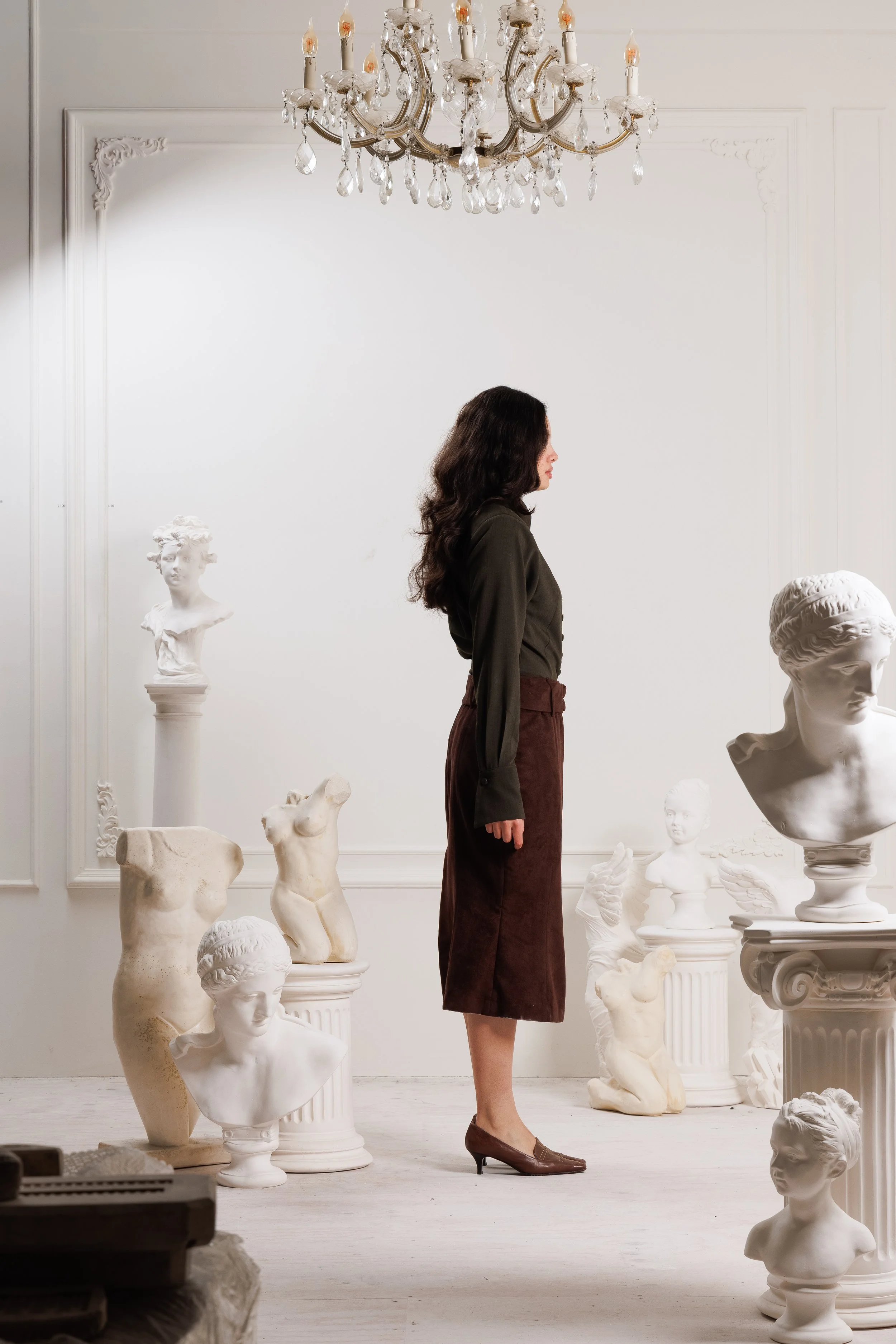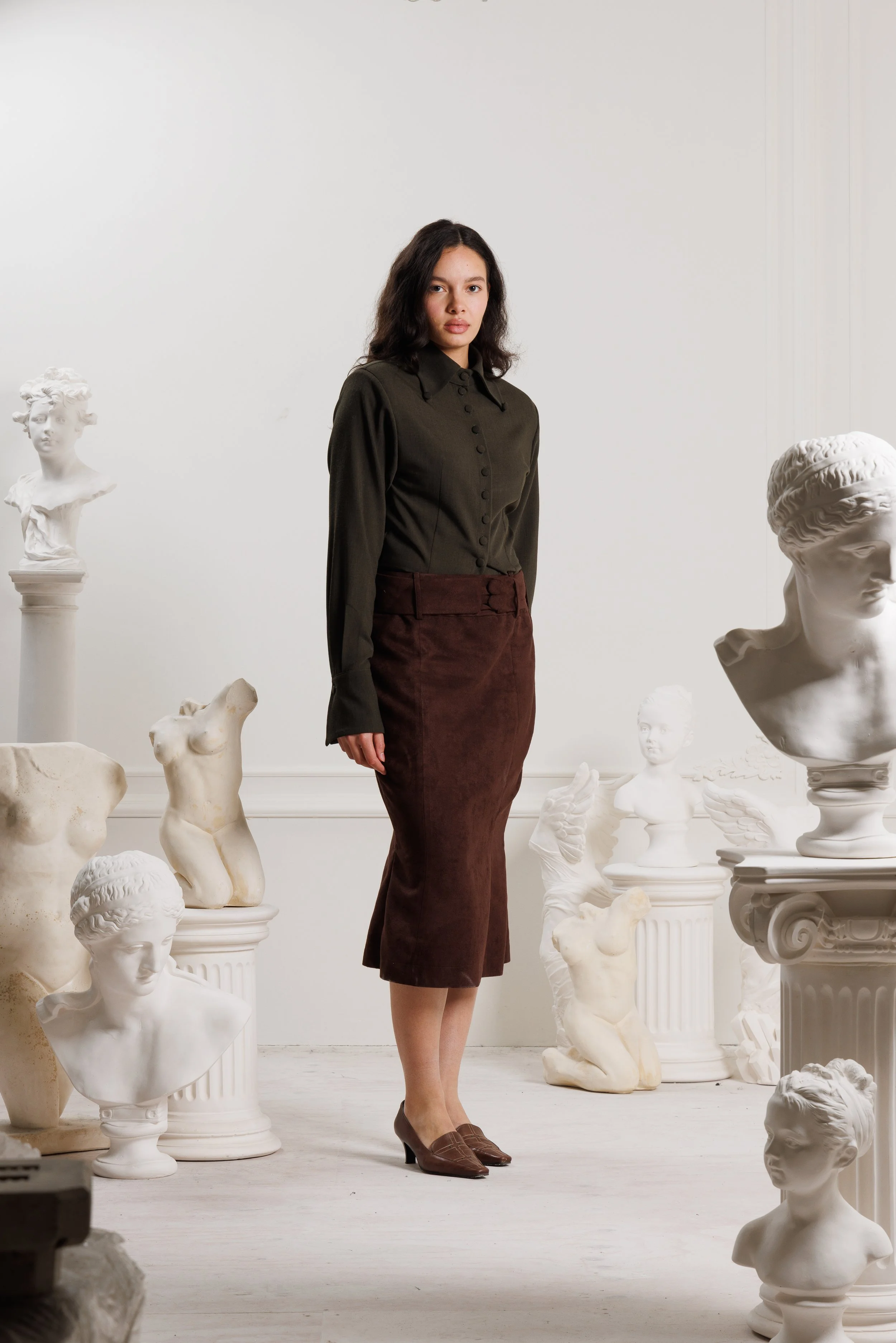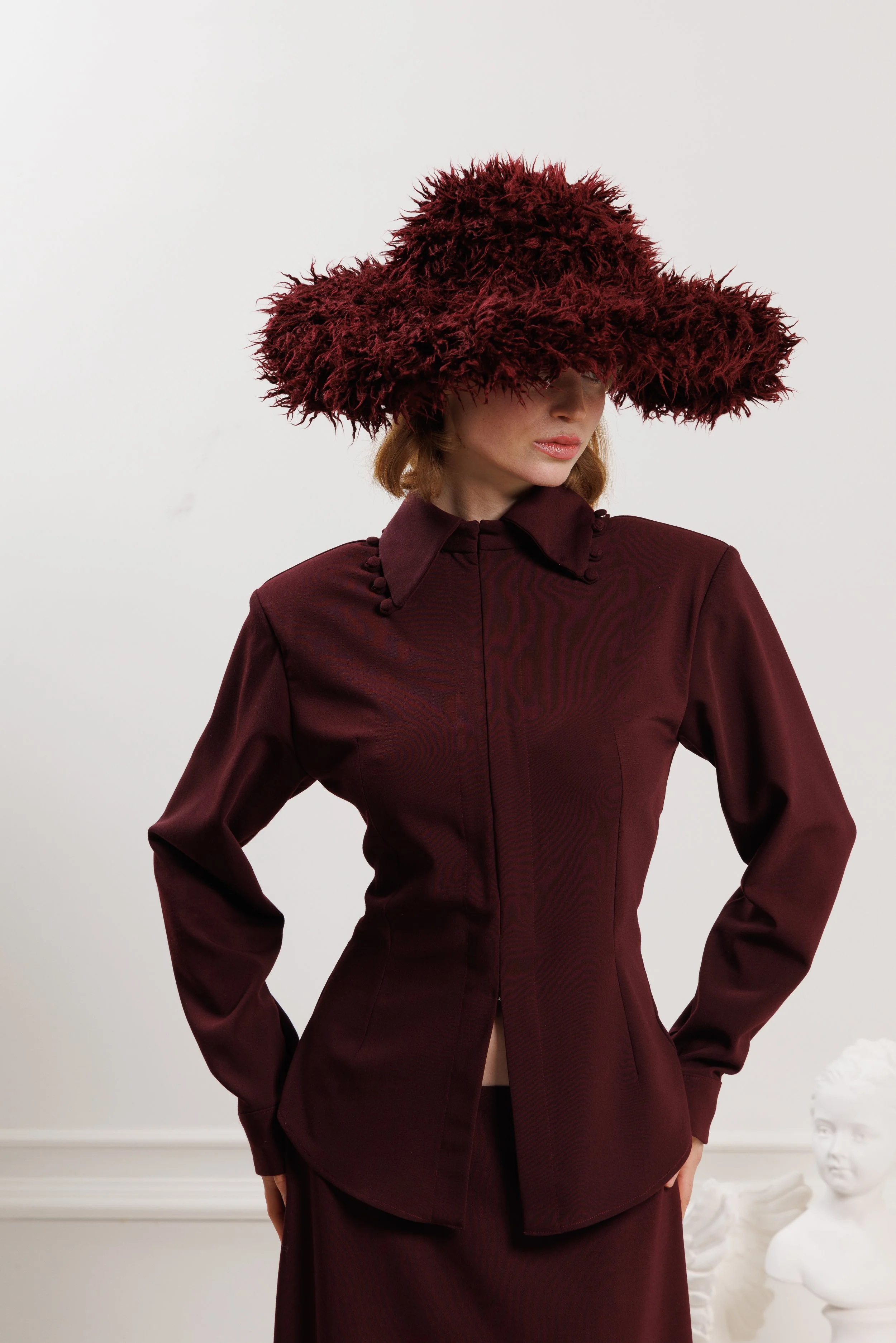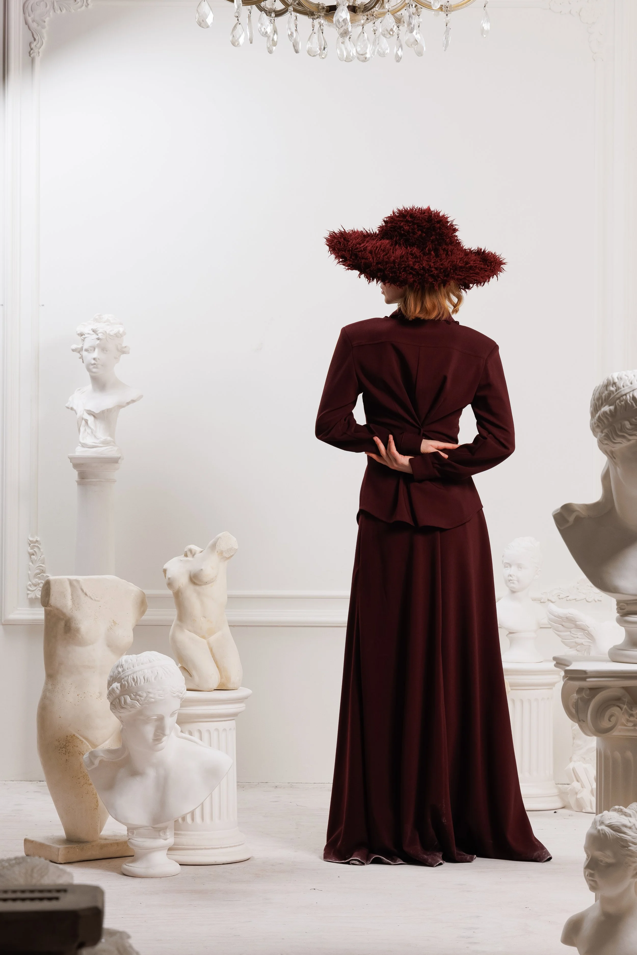 Worsted wool burgundy set. Button down with button details at the collar. Combined with an A line skirt.