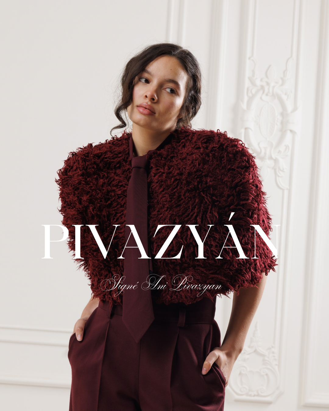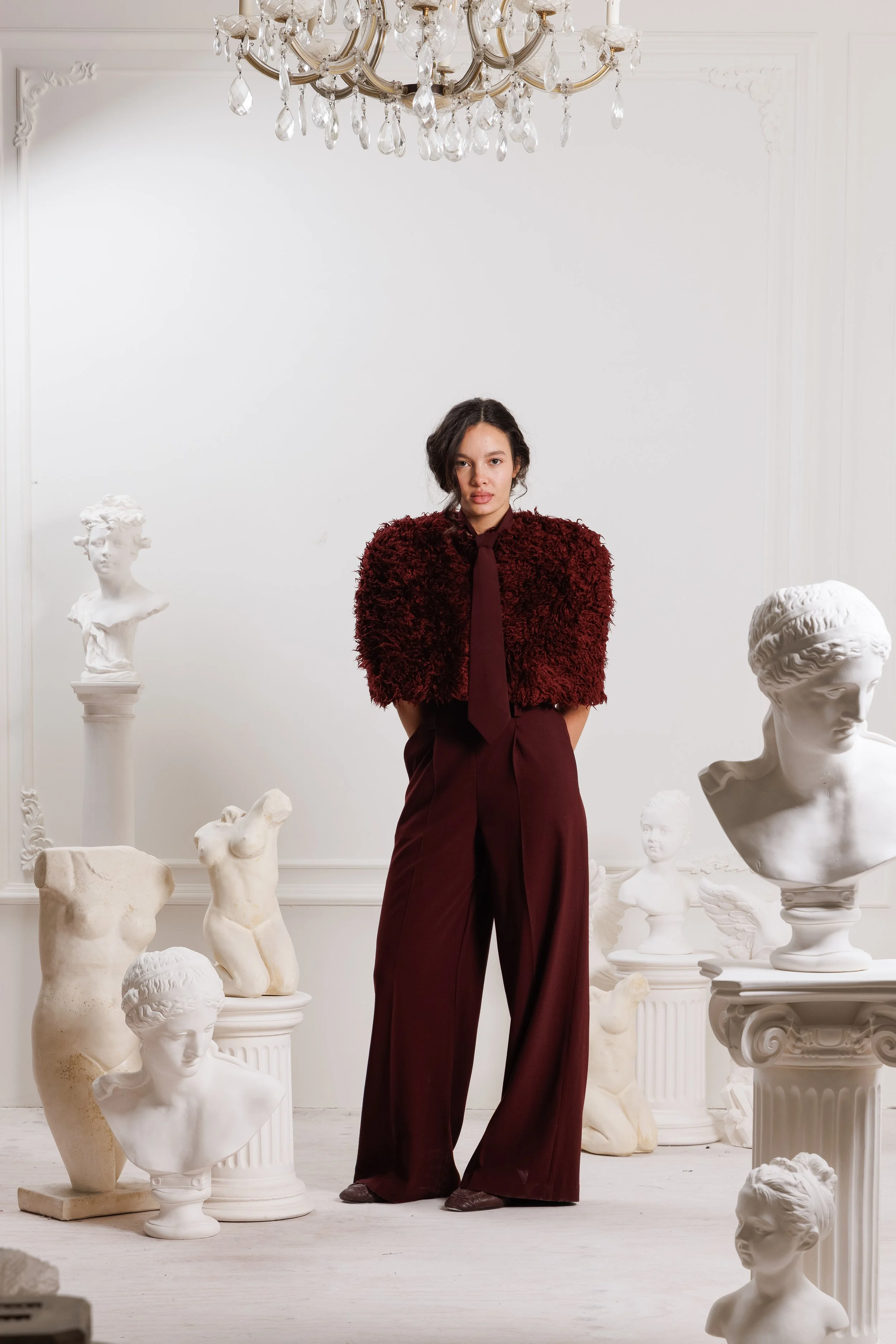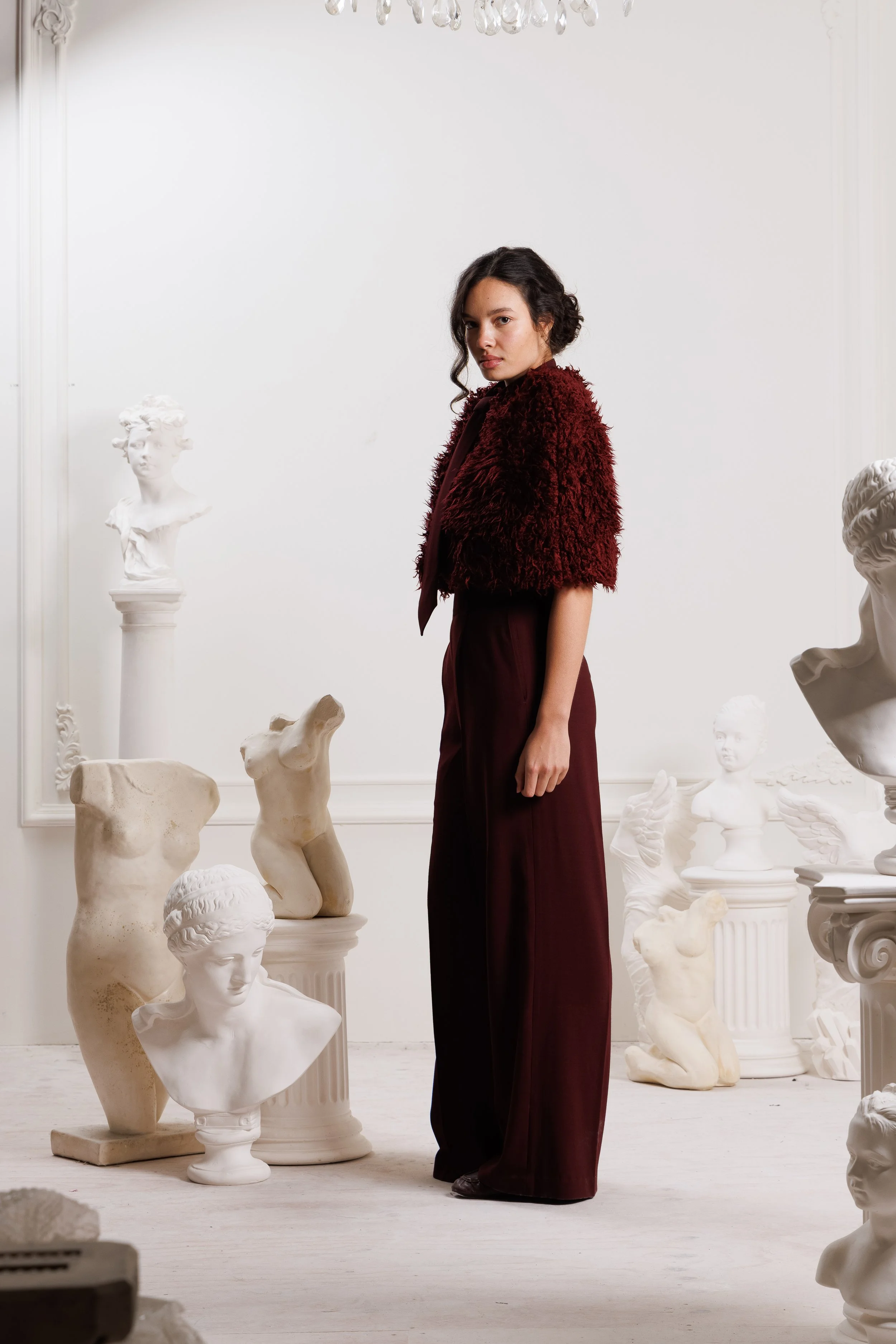 Worsted wool burgundy set. Wide leg trousers, featuring side and back pockets, front pleats and a high waistband. Cropped cape is made from faux fur. Fully lined and styled with wool burgundy tie.